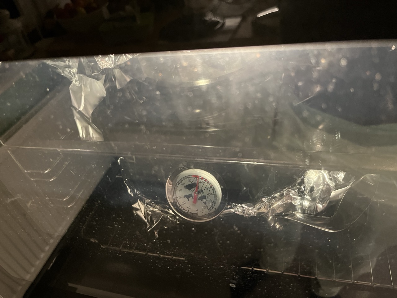 Die Hähnchen wurden mit einer Trockenmarinade eingerieben und dann vakuumiert und tiefgefrohren. Wenn möglich, wird noch Butter unter die Haut geschoben. Nach dem auftauen bei Zimmertemperatur sind sie in große Töpfe gewandert, in denen ein Wasserbad auf sie gewartet hat. Sie waren automatisch fast koplett mit Wasser bedeckt. Der Topf wurde mit Alu abgedeckt. Das alles wurde im Backofen mit Umluft bei 70°C für 8 Std gegaart. Die Temperatur wurde mit einem Bratentermometer, welches frei im Ofen lag, gemessen. Die Hähnchen sind bei 200°C für 75 Minuten im Ofen bei Heißluft knusprig gebraten worden. Unter den Hähnchen, welche auf einem Rost liegen, ist ein Blech mit dem Wurzelgemüse, welches dadurch geröstet und gegaart wird. Danach werden die Hähnchen in Alu eingepackt und bis zum Essen ruhen gelassen. Während dessen werden die Sossen gemacht und die Bleche mit den Kroketten für ca. 20 Minuten gebacken.