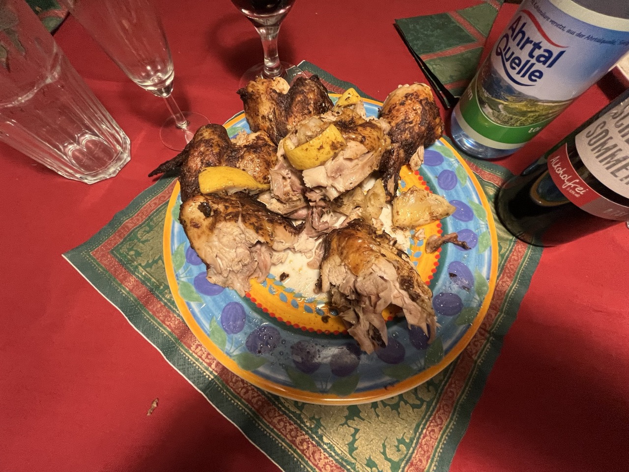 Das komplette Kochen dauert 1 Stunde und 45 Minuten, wenn die Hähnchen vorgegaart sind. Wenn man also um 17.30 Uhr essen möchte, müssen die Hähnchen um 15.45 Uhr in die Röhre. Sobald die Hähnchen aus dem Ofen sind, kommen die Kroketten in den Ofen und geben durch ihre Garzeit den Zeitpunkt vor, zu dem das Essen auf dem Tisch steht.