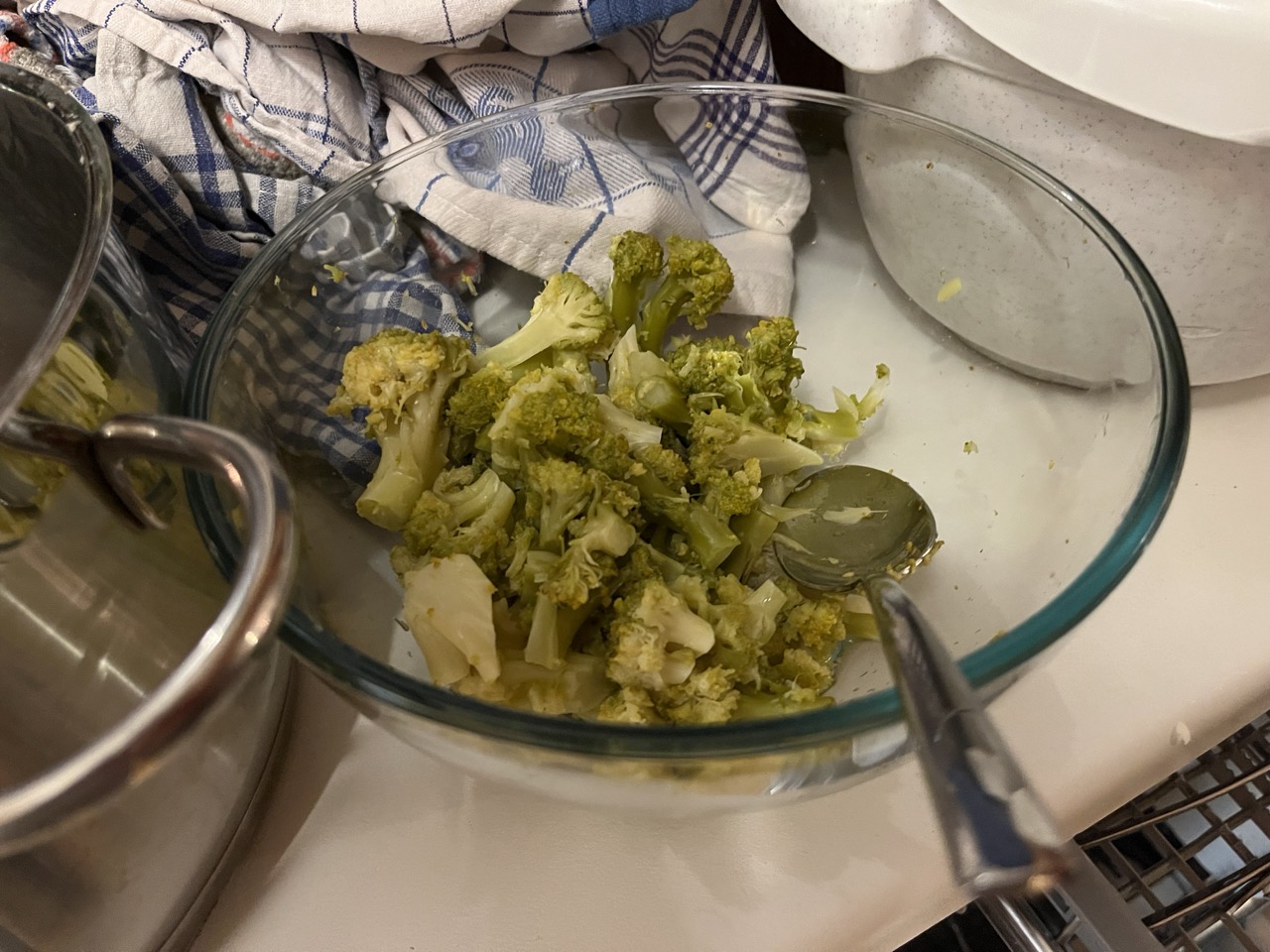 Das Gemüse wird während des Bratens der Hähnchen aldente gekocht, abgegossen und im Topf im Bett in Handtücher eingeschlagen bis zum Essen warm gehalten.