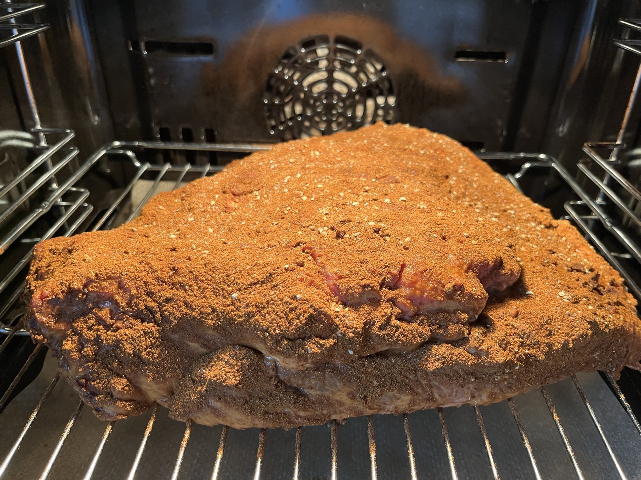 Die Rinderbrust mit Honig, Senf und Tomatenmark einreiben und danach mit der Gewürzmischung panieren. Da beim smoken die Temperatur durch die luft langsam und gleichmäßig verteilt wird, kann dort mit 120 °C gearbeitet werden. Im Ofen würde man dazu Umluft verwenden, welche aber aufgrund ihrer Stärke den Braten an bestimmten Stellen austrocknet. Daher verwendet man Ober- und Unterhitze, welche dann aber auf 140°C eingestellt wird. Wenn keine Umluft verwendet wird, muss man das Brisket aber auf das Blech legen, damit es von unten genug Hitze bekommt. (Ein Blech muss unter des Fleisch, weil es tropft) Macht man das nicht und legt das Fleisch auf einen Rost und das Blech einige Centimeter darunter, so schirmt das Blech die Hitze ab, was bei Umluft nicht passieren würde. Wenn die Kerntemperatur 64 Grad erreicht hat, kann man das Fleisch in Metzgerpapier oder Alu oder Backpapier einschlagen, damit es saftig bleibt und darin weiter im. ofen garen. Wenn die Kerntemperatur 94 °C erreicht hat, wird die Aktion beendet und das Fleisch 1 Stunde ruhen gelassen. Dann ist es immer noch warm genug, um es zu essen. Wenn man kann/möchte, kann man während des gesamten Vorgangs das Fleisch immer weider mit einer Mischung aus Wasser, Honig und Apfelessig einspühen/einpinseln.