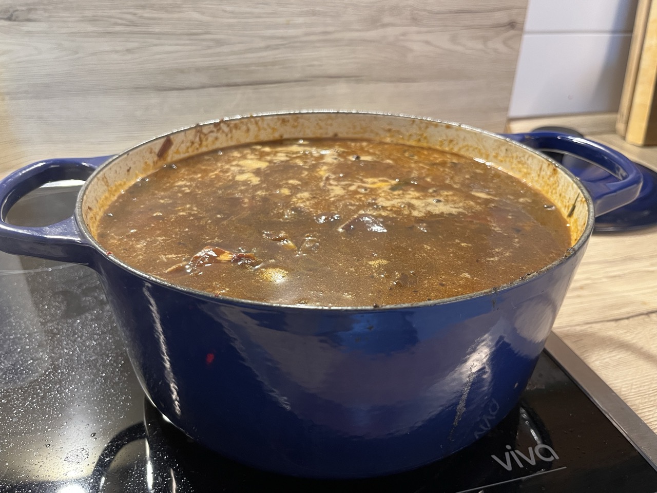 Die Knochen werden in Pflanzenöl sehr scharf angebraten. Danach kommt das gesamte Wurzelgemüse dazu und wird auch sehr scharf angebraten bzw. schon fast geröstet. Man sammelt so viele Röstaromen wie möglich, läuft aber ständig Gefahr einen teuren Haufen Kohle zu generieren. Wenn man sich nicht länger traut, werden alle Gewürze und das Tomatenmark hinzugefügt und ganz kurz mitgröstet, dann löscht man ein erstes Mal mit der halben Flasche Rotwein ab. Diese lässt man verkochen, bis wieder der Bratvorgang einsetzt und löscht erneut mit dem Rest des Rotweines ab. Auch den lässt man verkochen bis der Bratvorgang wieder einsetzt und füllt dann den Topf bis oben hin mit Wasser auf. Bis jetzt wurde sehr große Hitze verwendet, aber nun wird die Hitze so stark reduziert, bis die Inhalt nur noch so eben köchelt. Nun kommt der Deckel auf den Topf und es wird mindestens vier Stunden gekocht. Wer mag kann auch bis zu 24 Stunden weiterkochen. Danach wird der gesamte Inhalt in einen neuen Topf abgesiebt und bei größerer Hitze ohne Deckel zur Hälfte reduziert. Die Soße wird dann abgeschmeckt und abgebunden. In diesem Fall kamen nun die fertig gekochten Maronen mit in die Soße.